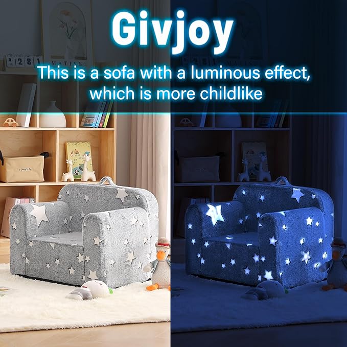 - 【Toddler Sofa Glow in The Dark】 Unique luminous design, cute star pattern. Simply place the toddler sofa under a bright light or sunlight for 10-15 minutes and bring it to a dark room to see the magic glow. The brighter the light shines, the stronger it glows in the dark.