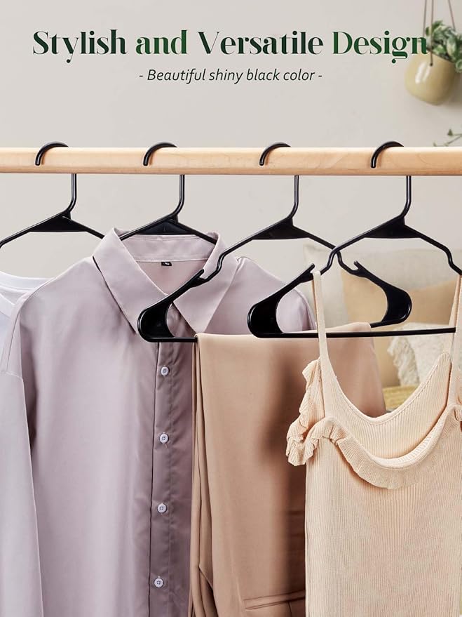 - Notched Shoulder Grooves: The Heshberg Black Plastic Hangers are thoughtfully designed with notched shoulder grooves, ensuring your clothing items stay securely in place. Say goodbye to stretched-out collars and slipping straps.