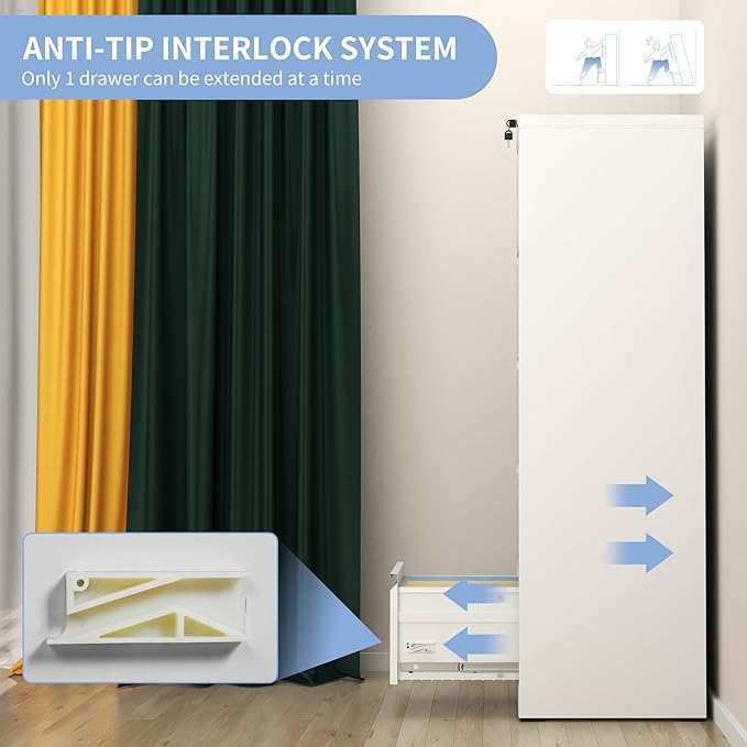 - ◉【Lockable & Secure】All the drawers of file cabinet can be locked by one lock, when one drawer of the metal file cabinet is opened, the anti-tilt and interlocking system prevents the other drawer from opening, ensuring your safety.