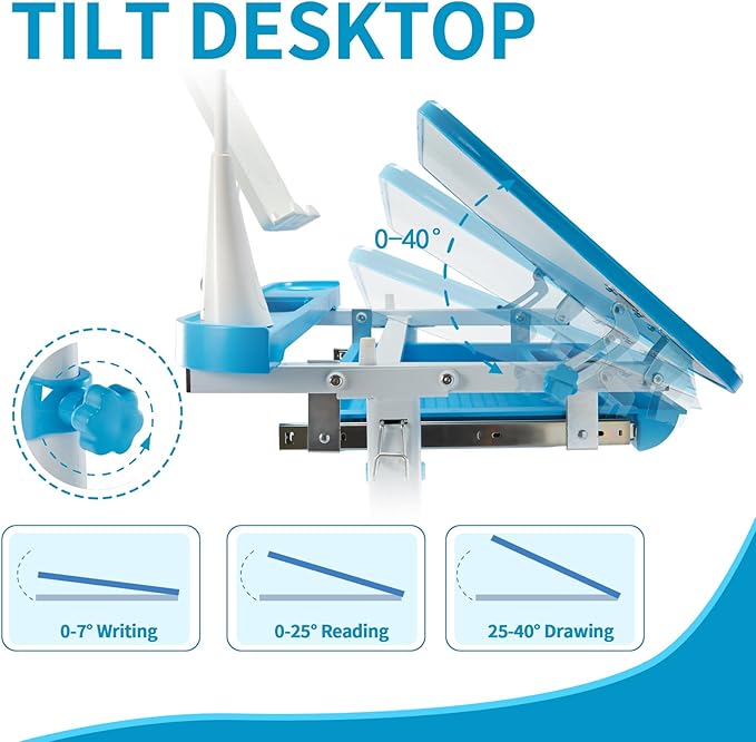 - 【Ergonomic Comfort Tiltable Desktop】The tiltable desktop allows your child to customize the angle(0~40°) of their study surface, promoting a healthy posture and reducing strain on their neck and back. It's a fantastic feature that ensures optimal comfort during long study sessions. Besides, this desk is equipped with anti-pinch stoppers to prevent hands from being pinched when kids rotate the desk.