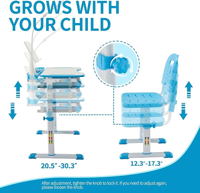 - 【Designed for Growing Minds】Our study tables are adjustable and ergonomic,you can easily adjust height of table and chair according to the height of the child, accompanied with children growth for long-term use. Kid study chair is perfact for children at age 7-12 Years.