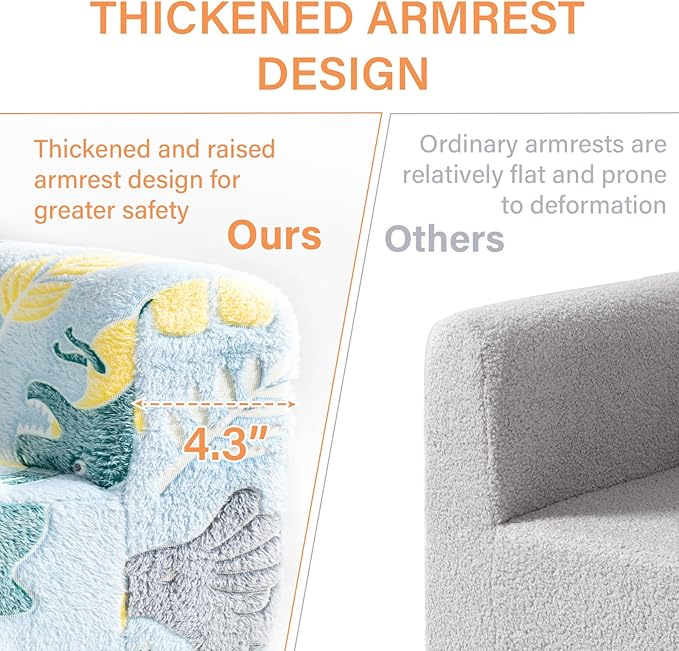 - 【Cloud-Like Back Support】This fluffy toddler chair is especially designed for little ones. Sitting in this fluffy toddler chair like snuggling a shining cloud. Toddler armchair cover is made of safe & skin-friendly durable cotton, we've utilized upgraded high-density sponge to enhance the durability and reliability of the kids chair, ensuring optimal protection for your child. So they will play games, eat snacks, watch TV, reading or just lie down and rest on the sofa.