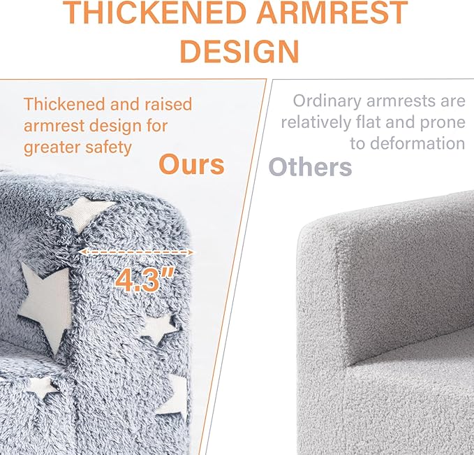 - 【Cloud-Like Back Support】This fluffy toddler chair is especially designed for little ones. Sitting in this fluffy toddler chair like snuggling a shining cloud. Toddler armchair cover is made of safe & skin-friendly durable cotton, we've utilized upgraded high-density sponge to enhance the durability and reliability of the kids chair, ensuring optimal protection for your child. So they will play games, eat snacks, watch TV, reading or just lie down and rest on the sofa.