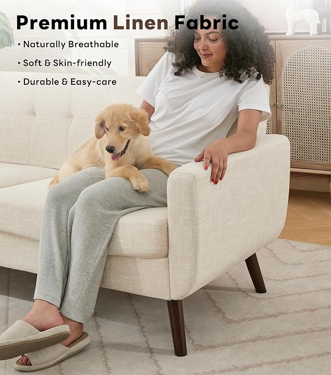 Tbfit 77.2" W Linen Sofa Couch, Mid Century Modern Decor Loveseat Couches for Living Room, Button Tufted Upholstered Small Couch for Bedroom, Solid, and Easy to Install Love Seats Furniture, Beige