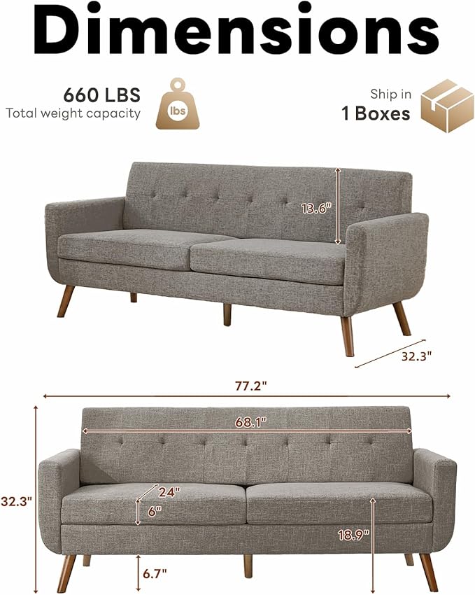 Tbfit 77.2" W Linen Sofa Couch, Mid Century Modern Decor Loveseat Couches for Living Room, Button Tufted Upholstered Small Couch for Bedroom, Solid, and Easy to Install Love Seats Furniture, Grey