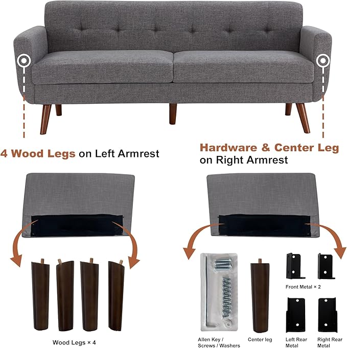 - EASY TO INSTALL: This sofa measures 77.2" W x 32.3" D x 32.3" H. There is a detailed installation manual and complete tool kit in the box, anyone can easily install it in 10 minutes. Tip: Hardware & center leg on the right armrest and 4 wood legs on the left armrest. We are glad to serve you, if you have any questions.