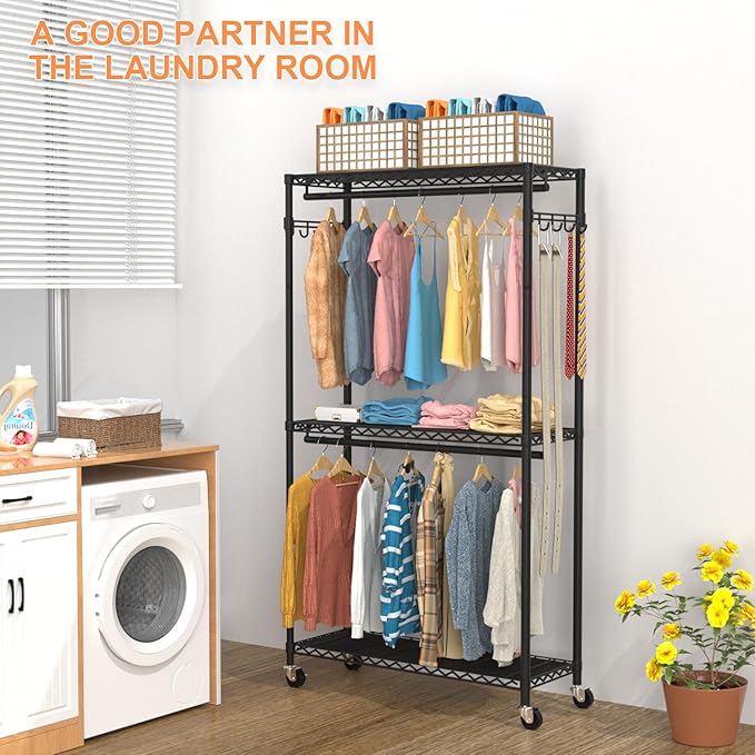 Clothes Rack, Clothing Racks for Hanging Clothes, 3 Tiers Adjustable Garment Rack with Wheels | Double Rods | Side Hooks | Heavy Duty | Load 445lbs | 15.7" D x 35.43" W x 78.34" H | Black