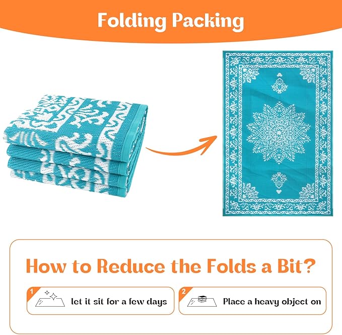 - 【Portable & Easy to Store】The lightweight foldable ourdoor rug package include carrying storage bag and 4 corner loops with 4 stakes to help fix the carpet in place. Easy to carry and space saving. Perfect camper must haves outdoor rug for camping, gatherings and RV trips.