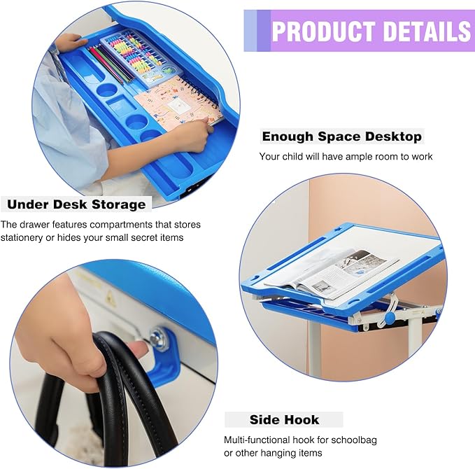 PayLessHere Kids Desk and Chair Set,Height Adjustable Study Desk for Kids with Pull Out Drawer Storage,Multi-Function Study Desk and Chair for Writing, Reading and Drawing,Blue
