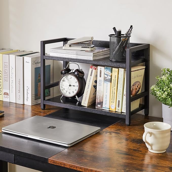- MULTIPURPOSE: This 2-tier countertop organizer can storage books and office items in the study, spices and snacks in kitchen, decorations in living room or use it as a makeup table to organize your cosmetics. It is always matched because of the pretty appearance.