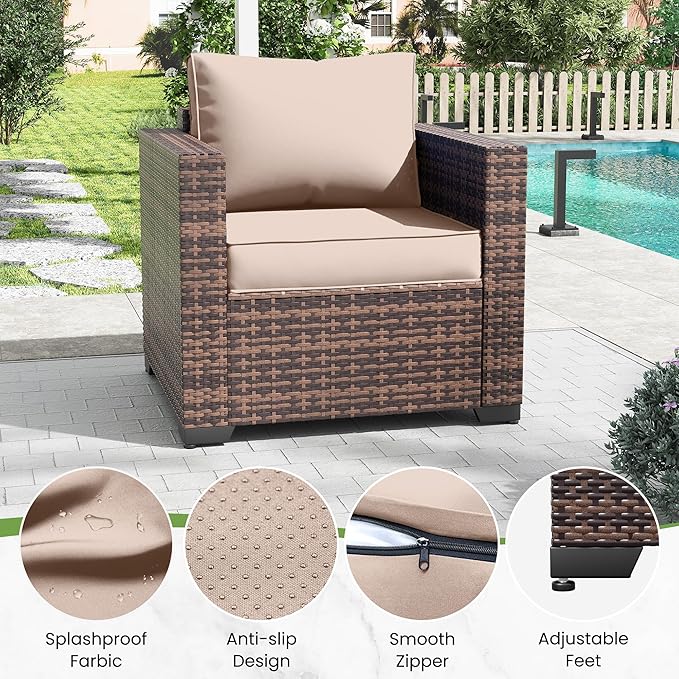 Amopatio Wicker Outdoor Sofa & Patio Couch Set - High Back Waterproof Patio Furniture Single Armrest Chair with Non-Slip Cushions, Outdoor Furniture Cover, Khaki