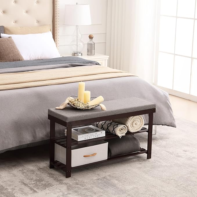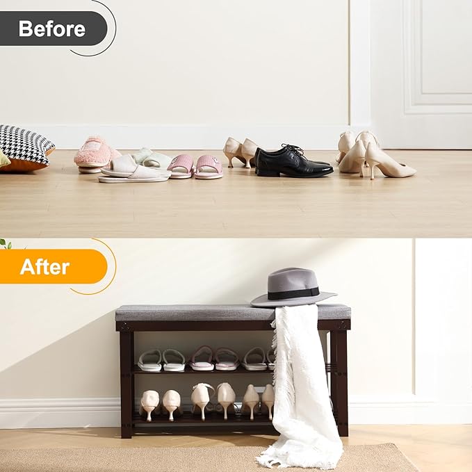 Apicizon 3-Tier Shoe Rack for Entryway, Bamboo Shoe Bench with Cushion Padded Seat, Small Shoe Organizer with Storage for Indoor Entrance Hallway Bedroom Living Room, 35.4 Inches, Brown
