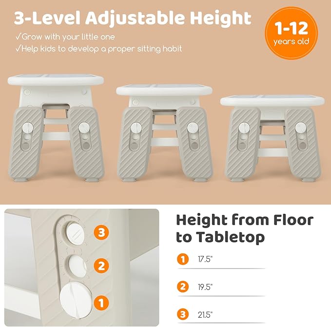 - [ Height Adjustable Design for Growing Kids ]: This kids activity table is designed with 3-level adjustable height to offer children an optimal height during their growth, which makes it suitable for kids aged 1-12 years old. Height from floor to tabletop: 17.5"/19.5"/21.5". And the adjustable and detachable drawing boards is convertible to meet various needs.