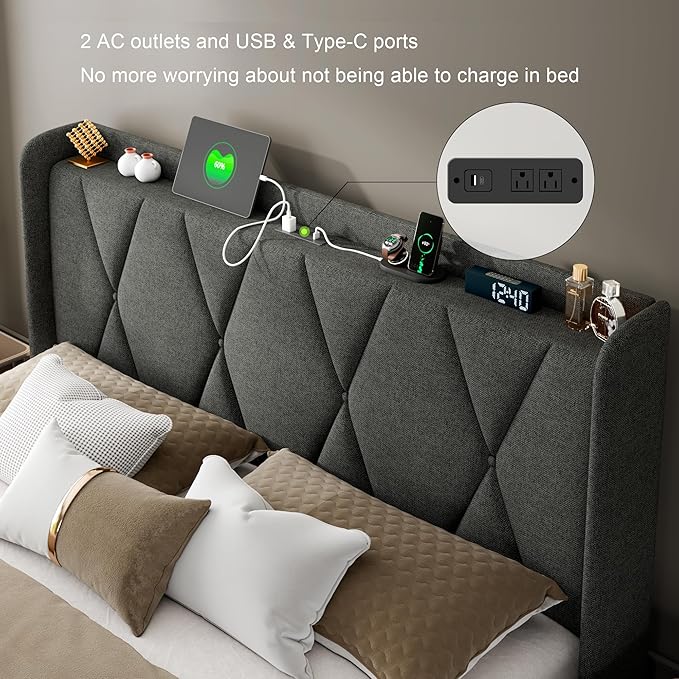 - Charging at Any Time: 2 AC outlets and 1 USB & 1 Type-C ports on the headboard, freely charging all electronic devices. 20W Fast Charging Ports (Type-C &Type-A) could greatly shorten the full charging time to 40 minutes and keep your phones always online