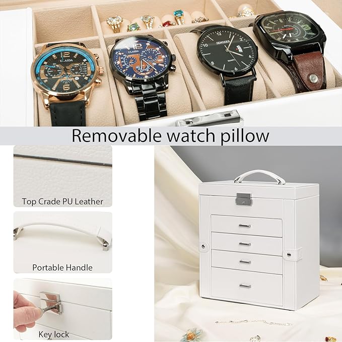 - 【LARGE CAPACITY,JUST TOP LAYER CAN BE LOCKABLE】:With 4 versatile pull out drawers, this white jewelry box can store jewelry accessories, such as rings, earrings, necklaces, chains, bracelets,Watches and so on. One deeper drawer is designed for large jewelries.There have a key to lock the top layer