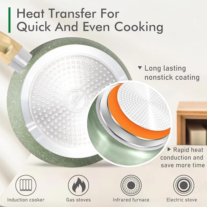 - 𝐄𝐯𝐞𝐧 𝐇𝐞𝐚𝐭𝐢𝐧𝐠 𝐓𝐞𝐜𝐡𝐧𝐨𝐥𝐨𝐠𝐲: Our pots and pans set is excluding of PFOS,PFOA, The set's even heating technology guarantees uniformly cooked meals. No more hot spots or unevenly cooked food – every dish is a masterpiece. Nonstick pot set for precise cooking