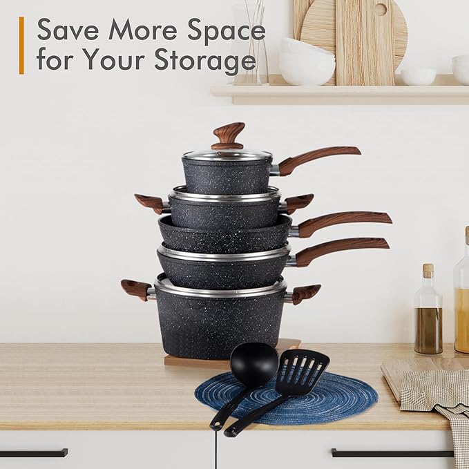 - 𝐍𝐨𝐧𝐬𝐭𝐢𝐜𝐤 𝐏𝐨𝐭𝐬 𝐚𝐧𝐝 𝐏𝐚𝐧𝐬 𝐒𝐞𝐭: The non-stick material allows light oil and less fumes, and the pan set is wear-resistant and lightweight, which enhances the experience of stir-fry cooking and makes cooking healthier