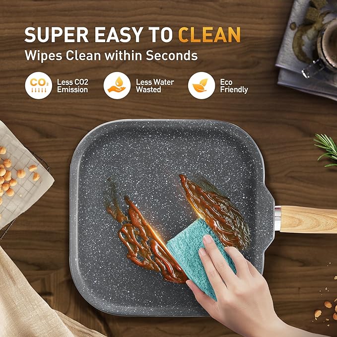 - 𝐄𝐚𝐬𝐲 𝐭𝐨 𝐂𝐥𝐞𝐚𝐧: Say goodbye to scrubbing and soaking. Our cookware features a smooth, easy-to-clean surface, ensuring that tidying up is as simple as enjoying your delicious creations. Easy to clean pots and pans set
