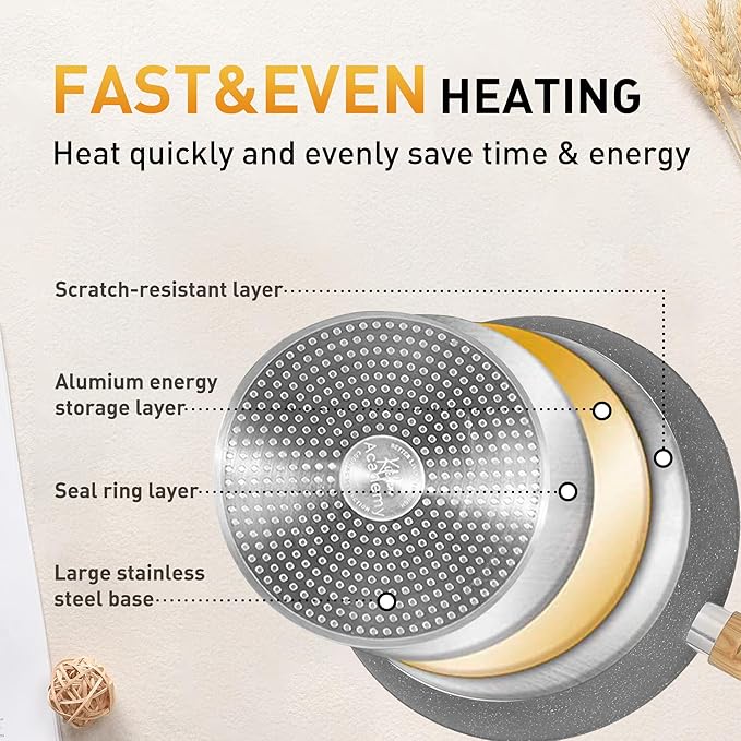 - 𝐄𝐯𝐞𝐧 𝐇𝐞𝐚𝐭𝐢𝐧𝐠 𝐓𝐞𝐜𝐡𝐧𝐨𝐥𝐨𝐠𝐲: Our pots and pans does not contain PFOS, The set's even heating technology guarantees uniformly cooked meals. No more hot spots or unevenly cooked food – every dish is a masterpiece. Nonstick pan set for precise cooking