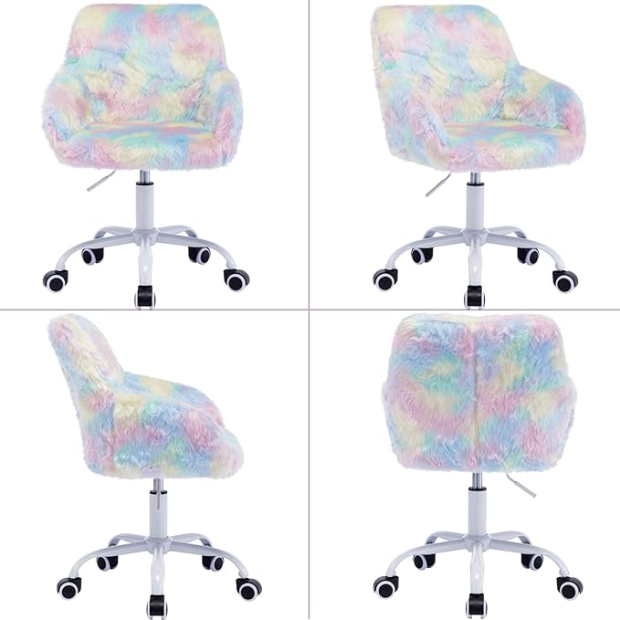 Kids Desk Chair Faux Fur Upholstered Swivel Reading Chair, Cute Adjustable Study Chair with White Wheels for Reading Room Bedroom, Rainbow Color