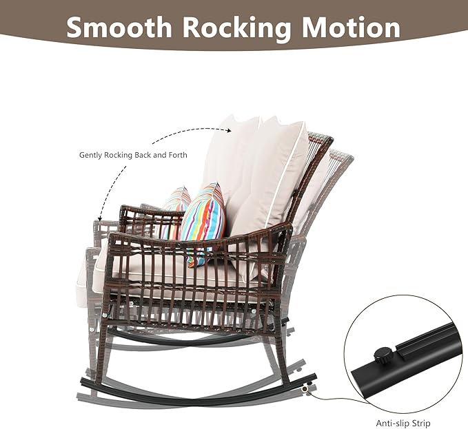 - Premium Cushion -- Rocking patio chair with thickened cushions gives you better support for your whole body, bottom cushion has a removable zipper for easy washing, which is easy to clean and gorgeous and durable for long-lasting.