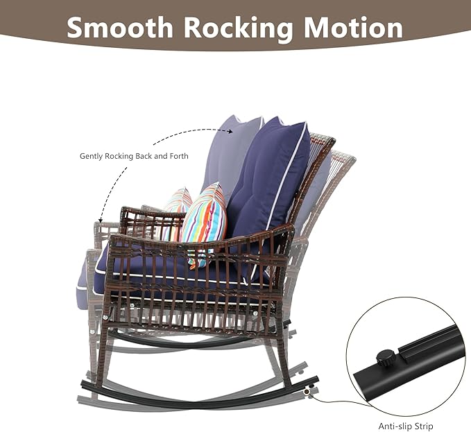 - Premium Cushion -- Rocking patio chair with thickened cushions gives you better support for your whole body, bottom cushion has a removable zipper for easy washing, which is easy to clean and gorgeous and durable for long-lasting.