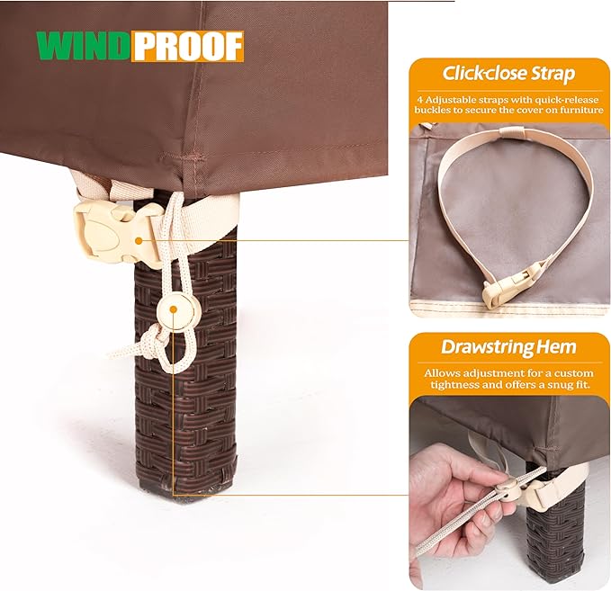 - ADJUSTABLE AND WINDPROOF RECTANGULAR PATIO TABLE COVER: Adjustable leg straps with buckles for windproof. Drawstring hem for custom tightness and snug fit.