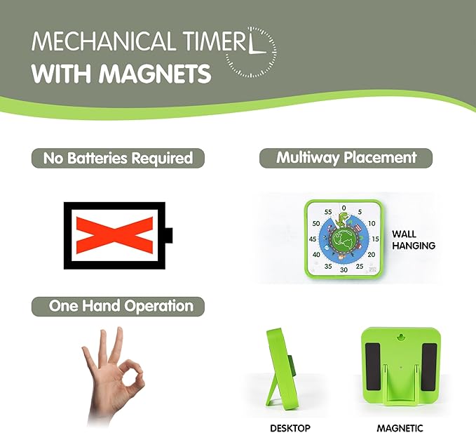 - 🕐 [ Specifications ] Measures 7.5x7.5 inches. No batteries required. One-handed operation. Stands on its own / hanging on the wall / sticks to a magnetic surface.
