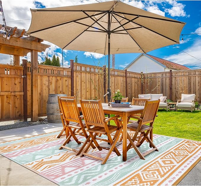 - REVERSIBLE AND VERSATILE: This plastic outdoor rug features universal colors and a reversible design, making it easy to refresh your outdoor space with just a quick flip. Suitable for use in any space or occasion, such as balcony, patio, porch, backyard, deck, beach, picnic, RV camping, etc.