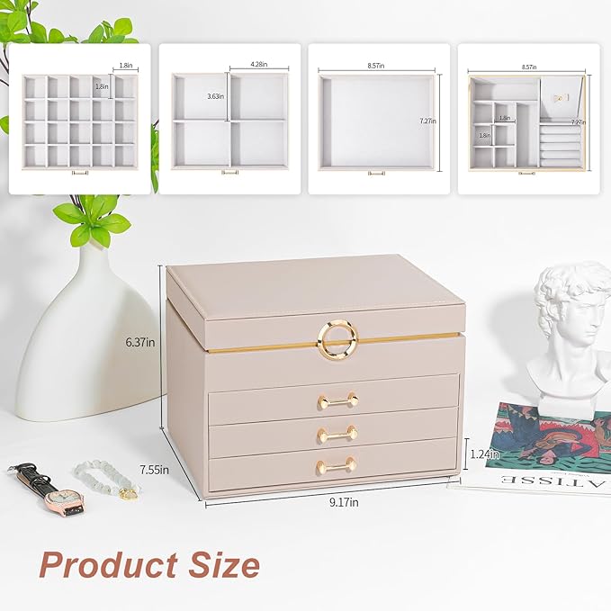 Jewelry Boxes for Women, Large Jewelry Storage Boxes, 4-Layer Leather Jewelry Organizer with 3 Drawers, Jewelry Display Case Gift for Women Girls, Apricot
