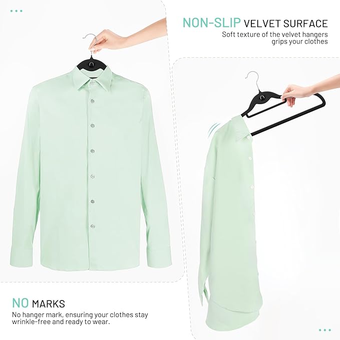- Non Slip Hangers: Soft and luxurious black hangers velvet surface provides a secure grip, ensuring your clothes don't slip off or leave lumps. Grooved design holds straps in place, great for your tank tops, underwear, dresses. Say goodbye to constantly picking up clothes that have fallen and embrace effortless tidiness in your wardrobe.