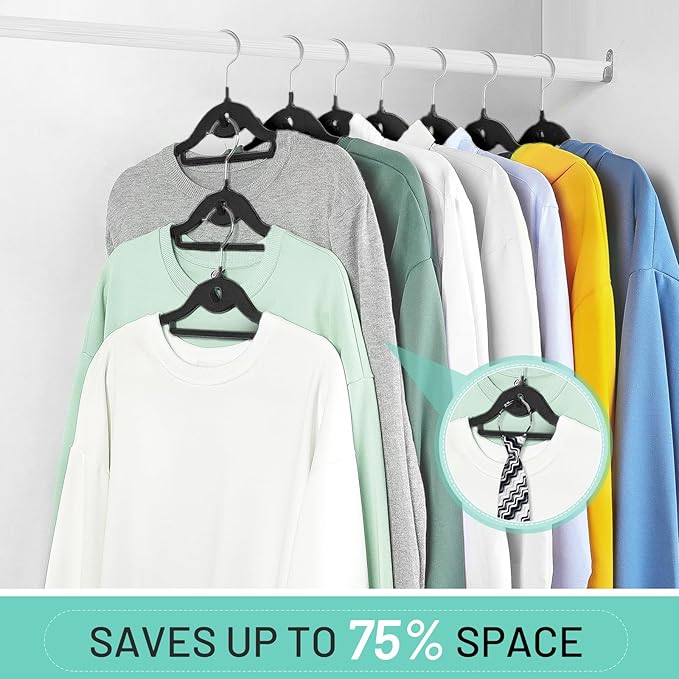 - 75% Space Saving: What makes coat hangers for closet special set unique is the ability to cascade 2 to 3 shirts using the small hooks on each black hanger. Hangers space saving with thin design for more space saving up to 75%. 360 degree swivel chrome hooks allow you to retrieve and hang clothes more conveniently and efficiently.