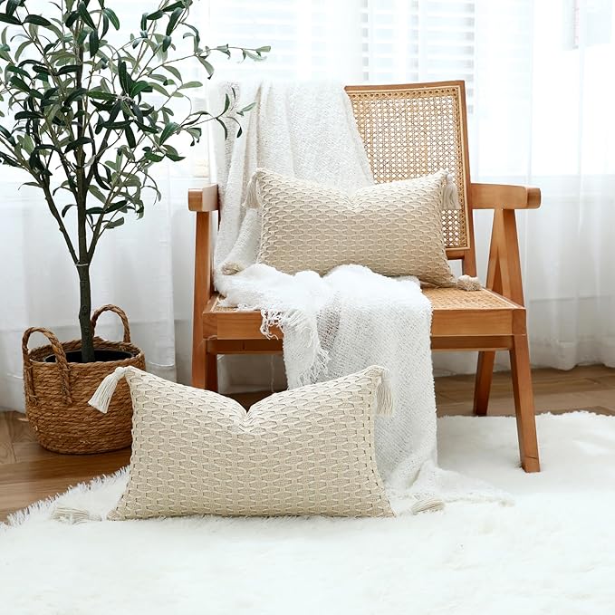 - BOHO CHIC DESIGN - Featuring an intricate woven geometric pattern, these boho outdoor lumbar pillows enhance texture and visual interest, creating a vintage, dynamic, and captivating look that stands out in any room. Whether your decor is farmhouse, bohemian, or modern, these neutral beige pillow covers serve as stylish accents to any space. They are adorned with hand-made playful tassels at each corner, enhancing their charming, cute and vintage appearance