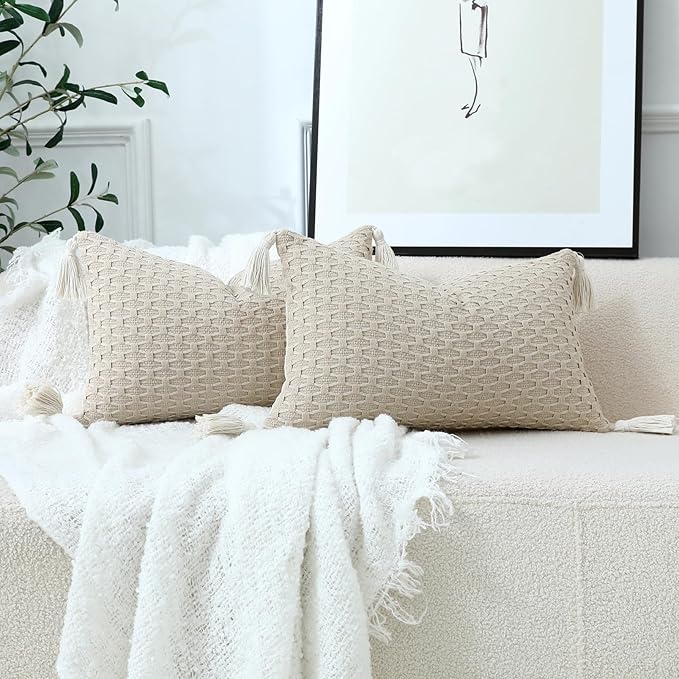 sykting Boho Outdoor Lumbar Pillow Covers 12x20 Set of 2 Thick Woven Neutral Beige Throw Pillow Covers with Tassels for Couch Sofa Living Room