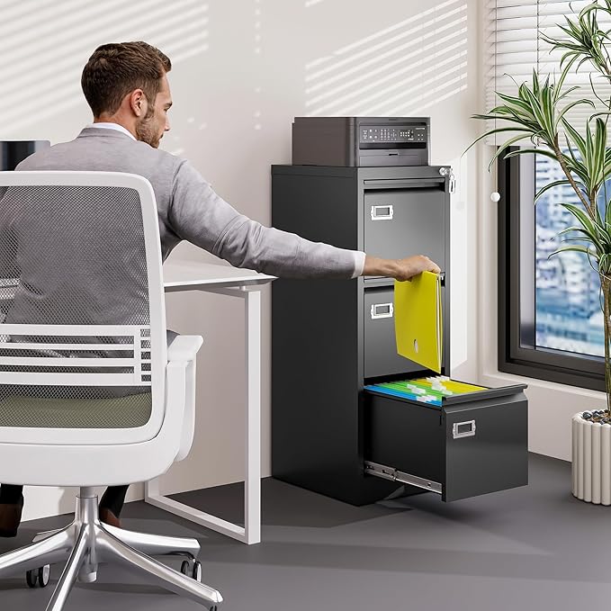 3 Drawer File Cabinet with Lock Metal Vertical File Cabinet Office Home Narrow File Cabinet for A4 Legal/Letter Size,Assembly Required (Black, 3 Drawers-Vertical)