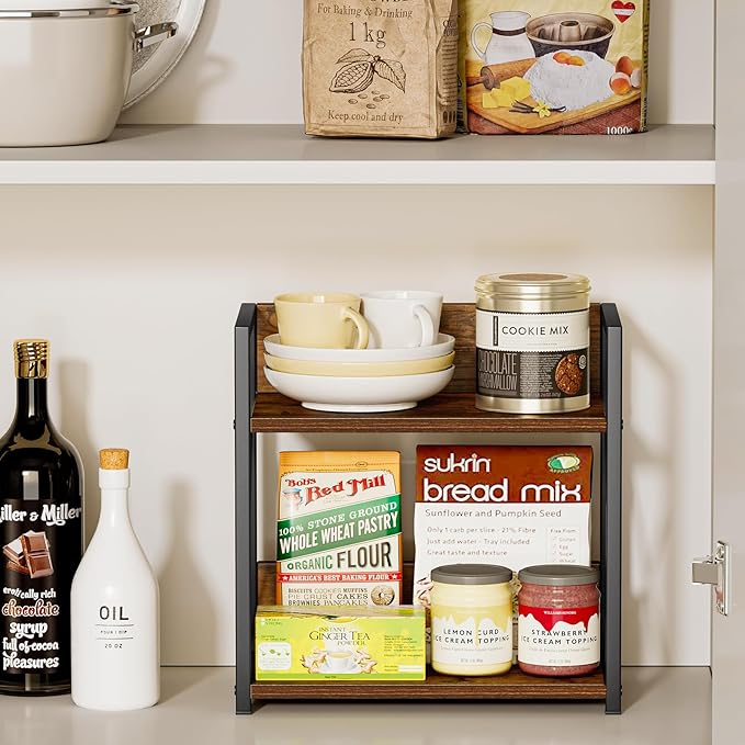 - 【Easy to Install & Cleaning】With detailed instructions and tools provided, you can have this 2-tier countertop shelf organizer assembled in 10 minutes. The wooden surface is waterproof and dust free, a damp cloth could keep the countertop organizer clean.