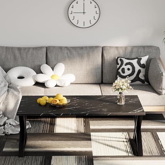 Coffee Table Living Room Table Black Center Table, Simple Modern Faux Marble Rectangular Tea Table with Sturdy Black-Finished Metal Frame,Industrial Wooden Coffee Table for Bedroom Home Office