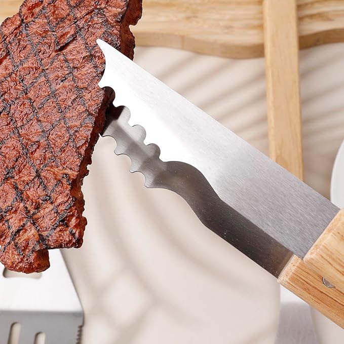 - **Superior Craftsmanship**: Crafted with high-grade stainless steel and natural wooden handles, these BBQ tools offer both exceptional durability and a timeless, rustic aesthetic that enhances any grilling experience.