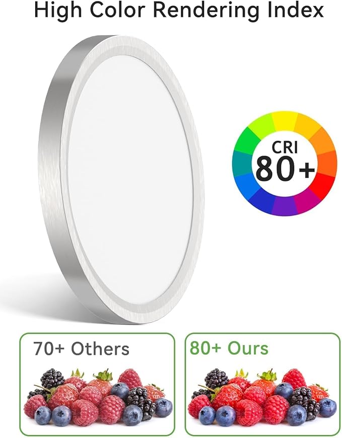 - [Eye Protection and After-Sales Service] There is no flicker, no blue light, no radiation, and no UV in satin brushed metal flush-mount lights. Your eyes are always well-lit by sources that are consistent and natural. Your home will have authentic and lively lighting thanks to the high CRI (>80). This silver-toned ceiling light fixture is safe to use, eco-friendly, and approved by ETL and CE. If you have any issues or questions about product, kindly contact us and we shall help you out.