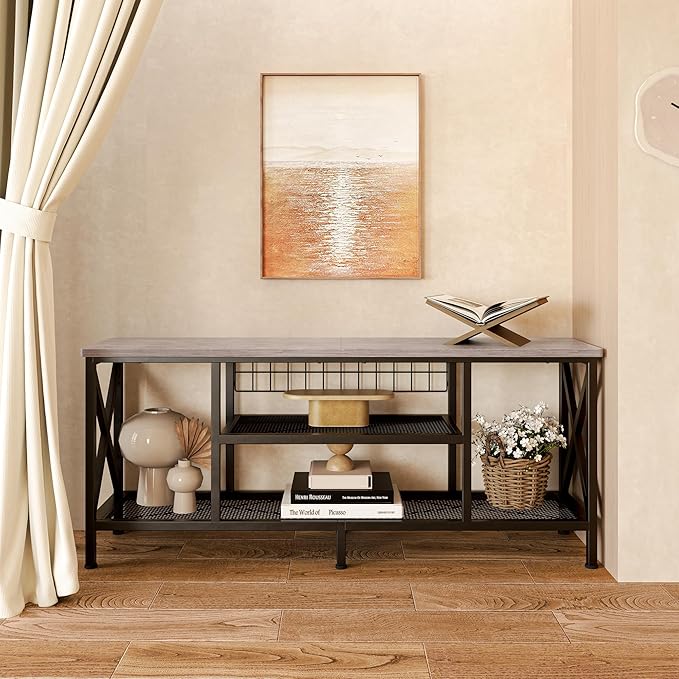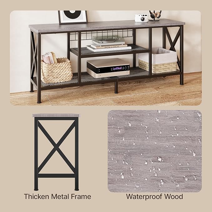 Gizoon TV Stand for 55-65 Inch TVs, 3-Tier Industrial Media Entertainment Center with Open Shelves, Metal Frame, 59.8'' Solid Wood Table top for Living Room, Bedroom, Office, Grey