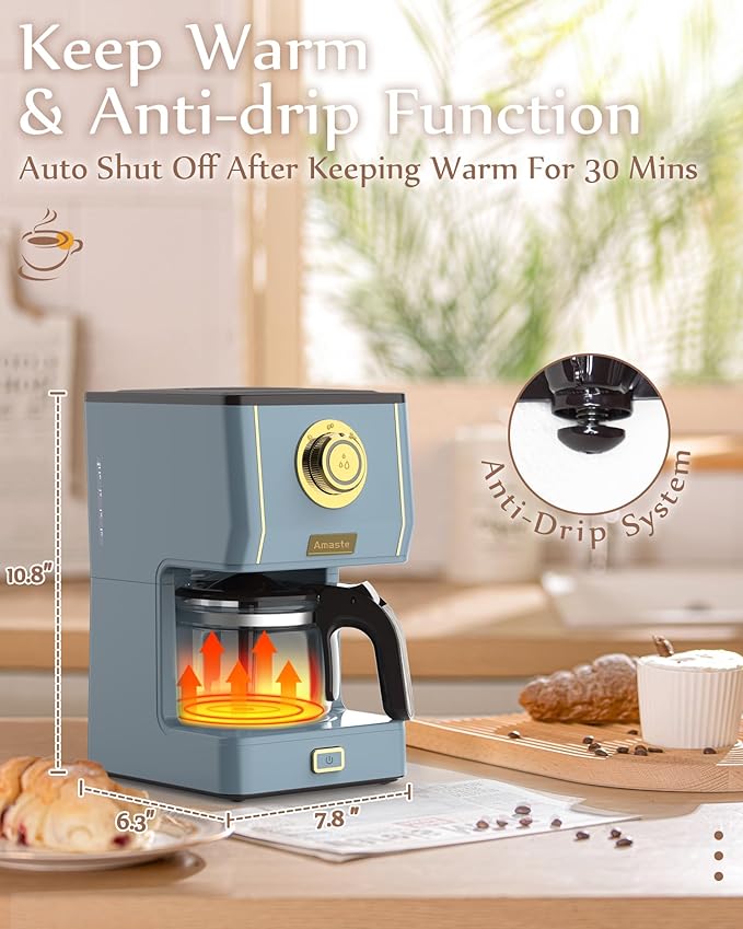 - AMASTE SETS THE STANDARD FOR COFFEE MAKERS THAT ARE AS FUNCTIONAL AS THEY ARE AESTHETICALLY PLEASING. Our 5 cup coffee maker not only maintains your coffee's warmth for 30 minutes to ensure flavor preservation but also features an automatic shutdown after 30 minutes of inactivity to prevent overheating. Additionally, the glass carafe and water tank come with marked levels, guiding you on the precise amount of coffee to use.