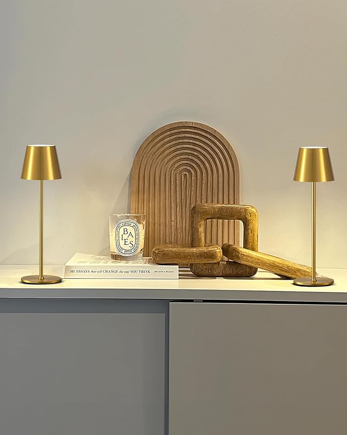 PUSU Cordless Rechargeable Table Lamp Set of 2, 4000mAh Battery Powered LED Desk Lamp, 3 Color Stepless Dimming Up, Portable Table Light Lamp for Bedroom Restaurant Outdoor (Gold)
