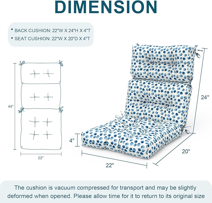 - 【PACKAGE】 - Package come with 2pcs tufted high back chair cushions with dimension seat cushion 22"W x 20"D x 4"T / back cushion 22"W x 24"H x 4"T, Please note product will arrive in a compressed state and allow a few hours to expand to final size listed in description