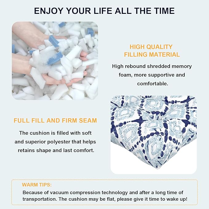 - 【PACKAGE】 - Package come with 2pcs water repellent patio seat cushions, with dimensions of 19" L x 19" W x 4" H, Please be noted that the product will arrive in a compressed state and it takes a few hours to expand to the final size as listed in the description