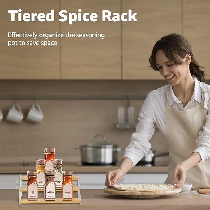 nianfeng Tiered Spice Rack, 3-Tier Spice Pantry Kitchen Cabinet Organizer, 12-Inch, Natural Wood Acrylic Stair Riser Stand, Countertop Seasoning Shelf