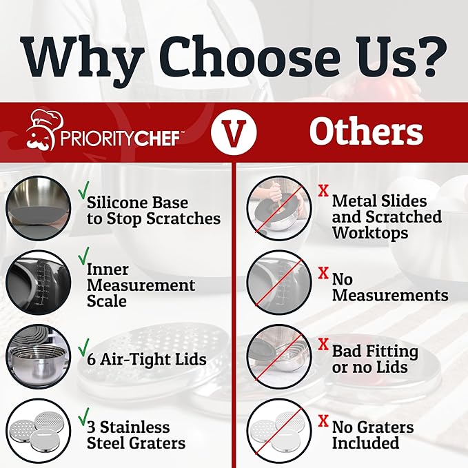 Priority Chef Stainless Steel Mixing Bowls with Lids Set, 3 Grater Attachments, Airtight Lids, Non-Slip Silicone Base Mixing Bowl Set, Large Prep Metal Mixing Bowls for Kitchen, Grey