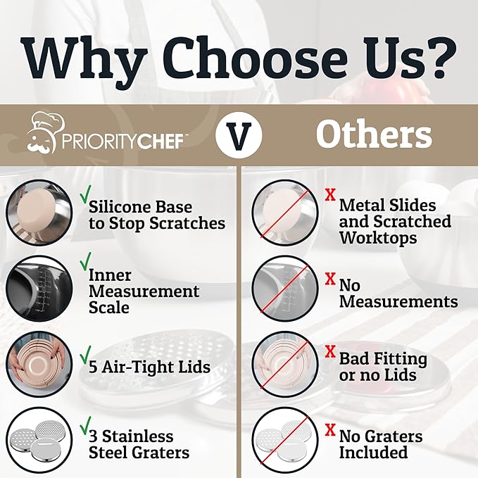 - One-Bowl Grating & Slicing: Make salads and dishes directly in the bowl with our innovative grater attachments, minimizing cleanup and enhancing efficiency. Enjoy the simplicity of slicing cucumbers or grating cheese straight into the bowl, making meal prep quicker