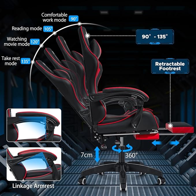 - 【Ergonomic Game Chair】135° reclining gamer chair with wrapped backrest,headrest,and lumbar pillow fits the player's spine curve, effectively alleviates the pressure on the back and improve your gaming experience