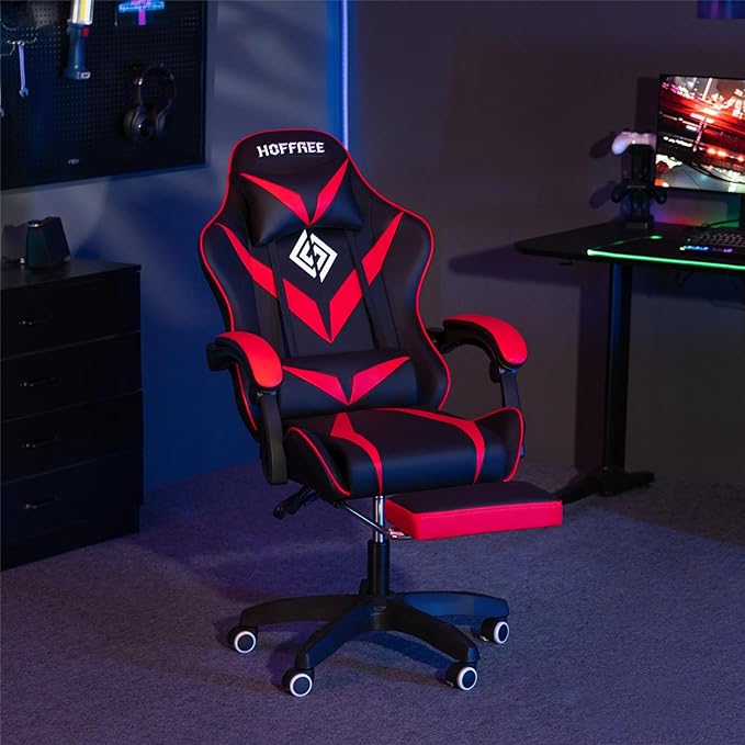 HOFFREE Massage Gaming Chair for Kids Computer Gamer Chair with Footrest and Lumbar Support Reclining PC Game Chair with Headrest for Gaming Room Red and Black