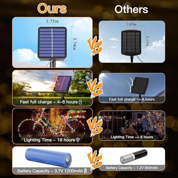 - 【Fast Charging Long Lasting】The outdoor string lights equipped with an 1200mAh rechargeable battery that can be quickly fully charged within 6 hours. Once charged, the lights can shine for about 18 hours. The lights are also equipped with a built-in sensor that automatically turns them on at dusk and off at dawn, making them more efficient and convenient to use